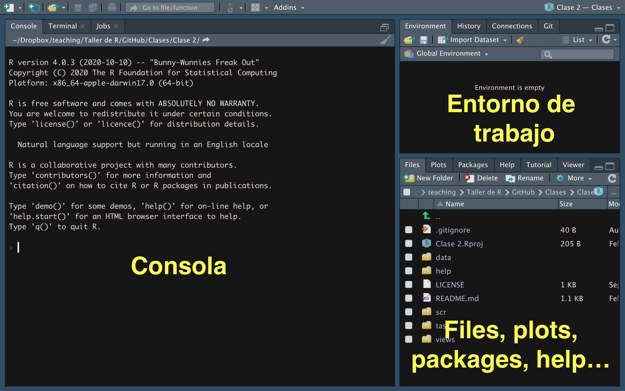 Environment (Entorno): Muestra todos los objetos que hemos creado en la sesión actual (datos, variables, resultados). Es como el “inventario” de lo que existe en la memoria de R en este momento.